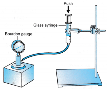 Apparatus: A set of Boyle’s law apparatus consisting of a graduated glass syringe, standard weights, Bourdon gauge, rubber tubing, retort stand