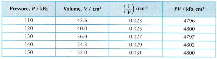 - The values of pressure, P, volume, V, 1/V and PV are tabulated.
