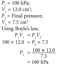 Example 1. The air in a syringe has an initial volume of 12.0 cm3 and pressure of 100 kPa. The nozzle of the syringe is closed and the piston is pushed inwards until the volume of the air becomes 7.5 cm3. What is the pressure of the compressed air in the syringe?