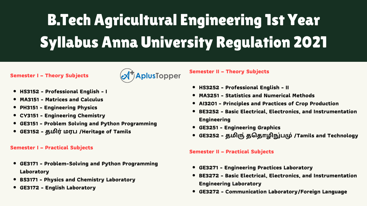 In India, Agriculture is the major sector and plays a key role in the production of varieties of rice and vegetables. The demand for agri production with old techniques required the latest technologies to enhance its productivity for sustainable development in the agri sector. Many students nowadays give priority to the agricultural sector through their options to evolve into that field. To encourage the students towards agriculture for more opportunities, Anna University offers a B.Tech Agricultural Engineering course based on regulation 2021 relevant to affiliated institutions.