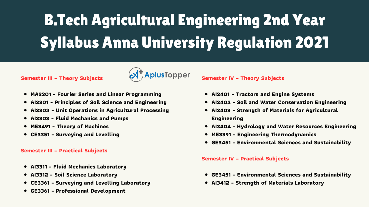 Anna University, B.Tech Agricultural Engineering conducts semester mode examinations every year. In the Second year, there are 2 semesters. Two semesters have both theory and practical subjects. In the third semester, there are six theory subjects and four practical subjects. In the Fourth semester, there are six theory and two practical subjects. The following links will help you to find them.