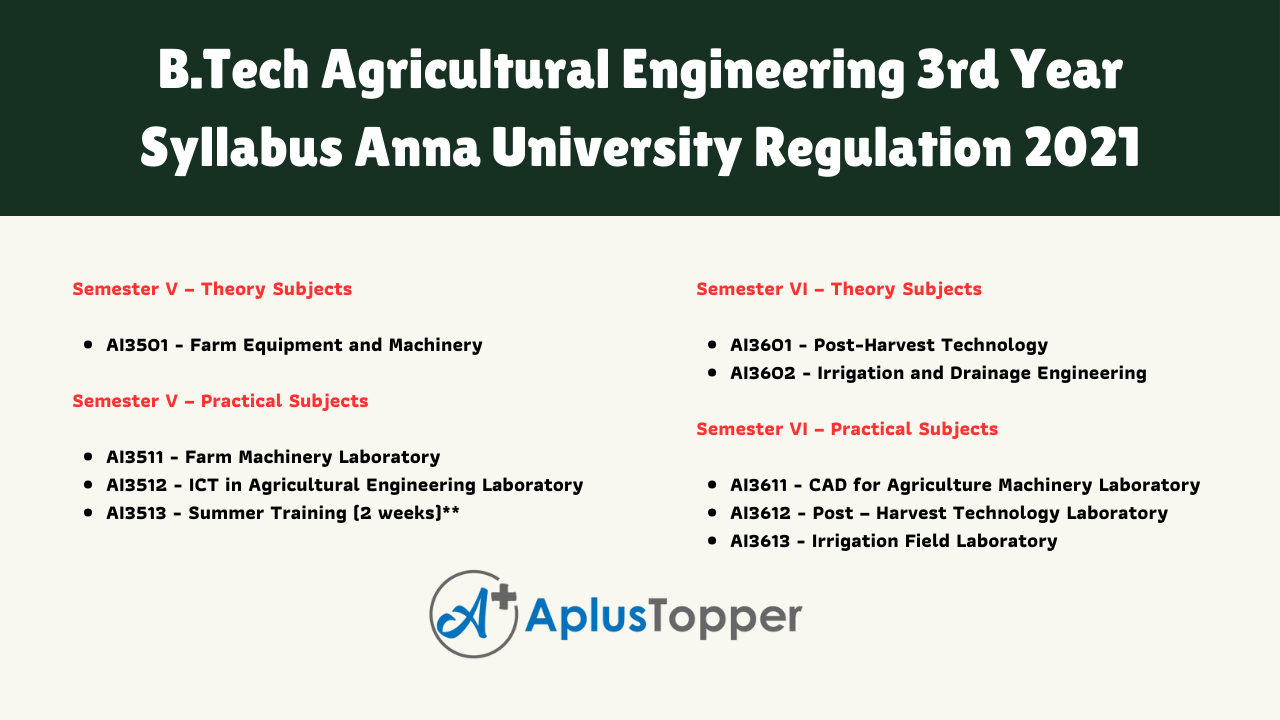 Anna University, B.Tech Agricultural Engineering conducts semester mode examinations every year. In the Third year, there are 2 semesters. Two semesters have both theory and practical subjects. In the Fifth semester, there is one theory subject and three practical subjects. In the sixth semester, there are two theory and three practical subjects. The following links will help you to find them.