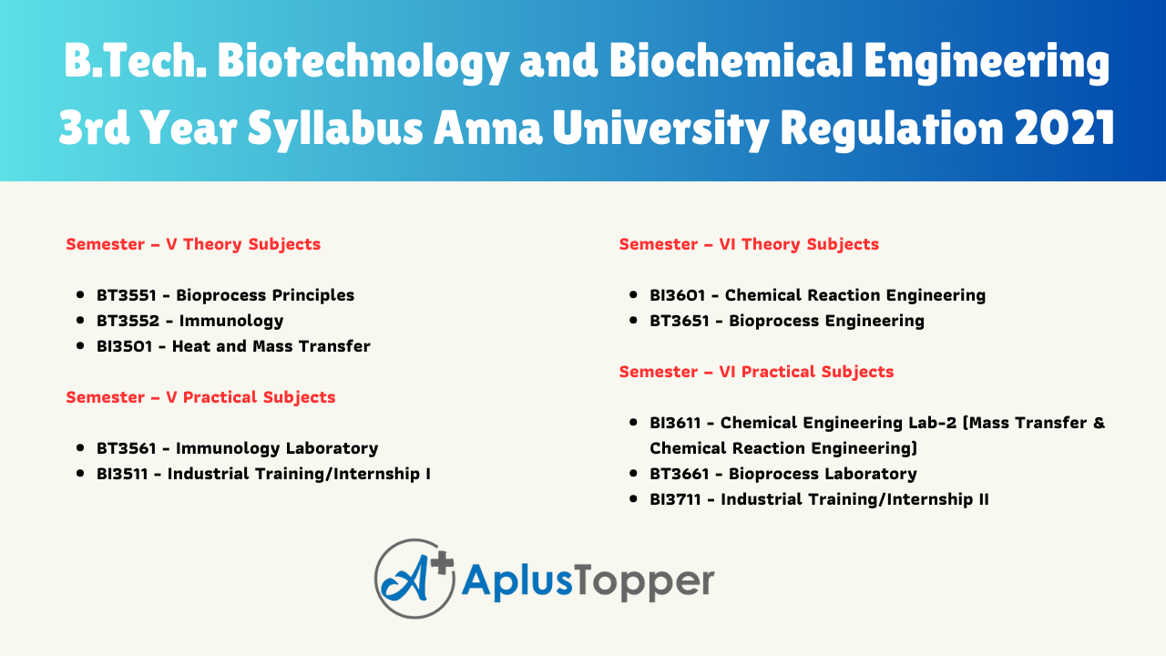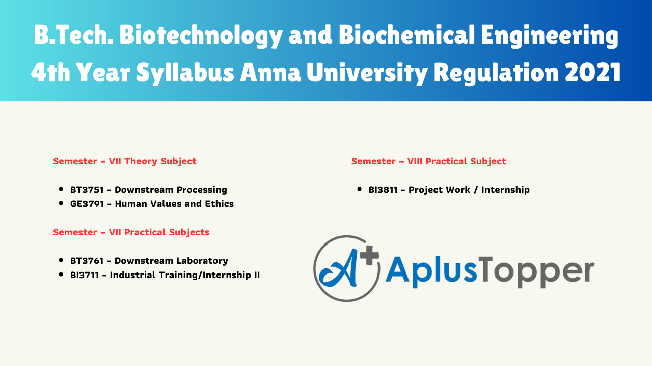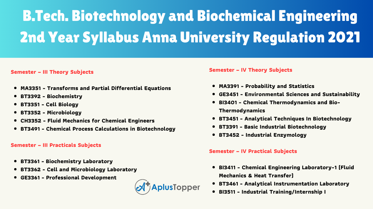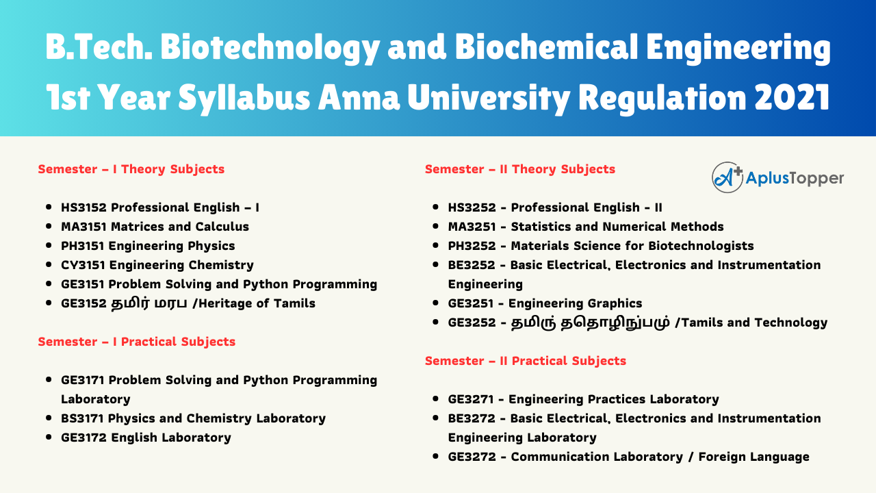 B.Tech Biotechnology and Biochemical Engineering syllabus, Anna University based on regulation 2021, related to affiliated institutions. Anna University offers this excellent course for students who want to pursue this as their career choice. We intend to provide the year-wise, semester-wise, and unit-wise syllabus of B.Tech Biotechnology and Biochemical Engineering. It will assist the students have a clear picture of the syllabus. According to this article, we include all the details required for students based on their points of view. Hope you will understand the syllabus and concepts to prepare for the examinations. Thank you for viewing our page aplustopper.com. Don’t forget to share it with your friends.
