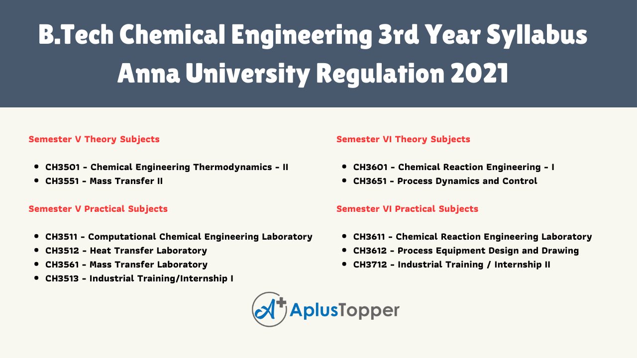 B.Tech Chemical Engineering Syllabus Anna University Regulation 2021, has been conducting the examinations in the semester mode. In the Third Year, there are two semesters. Each semester has both theory and practical subjects. There are two theory subjects and three practical subjects in the Fifth semester. In the Sixth semester also there are two theory subjects and three practical subjects.