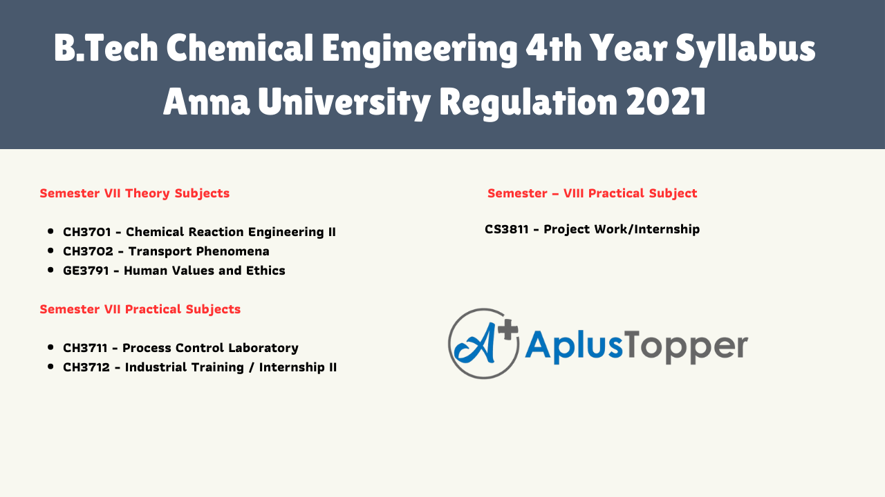 B.Tech Chemical Engineering Syllabus Anna University Regulation 2021, has been conducting the examinations in the semester mode. In the Fourth Year, there are two semesters. Each semester has both theory and practical subjects. There are three theory subjects and two practical subjects in the seventh semester. In the Eighth semester also there is one practical subject.