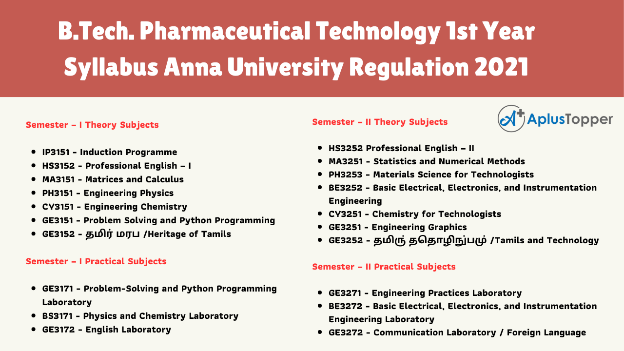 Anna University Regulation 2021 B.Tech. Pharmaceutical Technology 1st-year syllabus contains two semesters. In semester 1, there are six theory subjects and three practical subjects. In semester 2, there are six theory subjects and three practical subjects. The following links will help you to get the required subject as per your need.