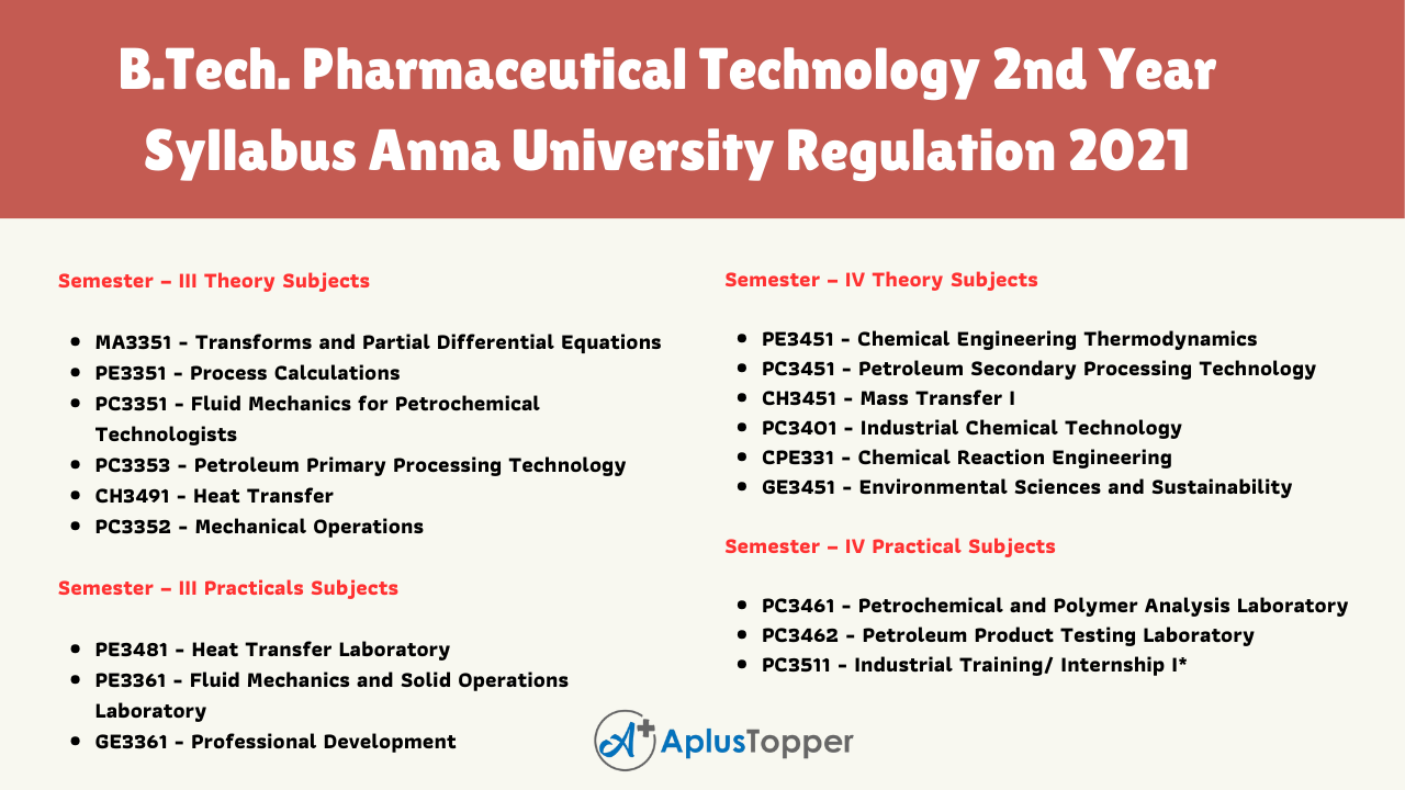 Anna University Regulation 2021 B.Tech. Pharmaceutical Technology’s 2nd-year syllabus contains two semesters. In semester 3, there are six theory subjects and three practical subjects. In semester 4, there are six theory subjects and Four practical subjects. The following links will help you to get the required subject as per your need.