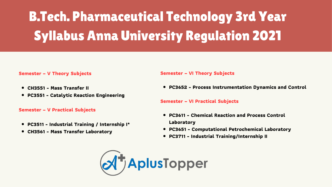 Anna University Regulation 2021 B.Tech. Pharmaceutical Technology’s 3rd-year syllabus contains two semesters. In semester 5, there are two theory subjects and two practical subjects. In semester 6, there is one theory and three practical subjects. The following links will help you to get the required subject as per your need.