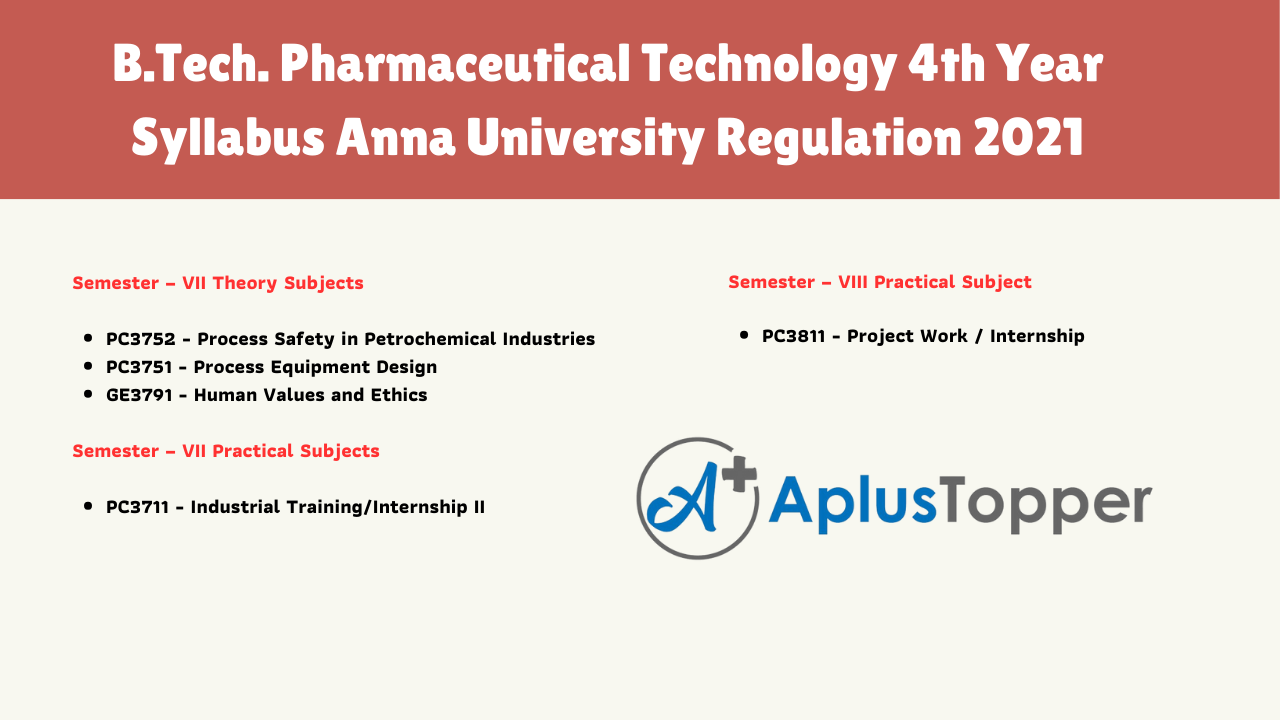 Anna University Regulation 2021 B.Tech. Pharmaceutical Technology 4th-year syllabus contains two semesters. In semester 7, there are three theory and one practical subject. In semester 8, there is one practical subject. The following links will help you to get the required subject as per your need.
