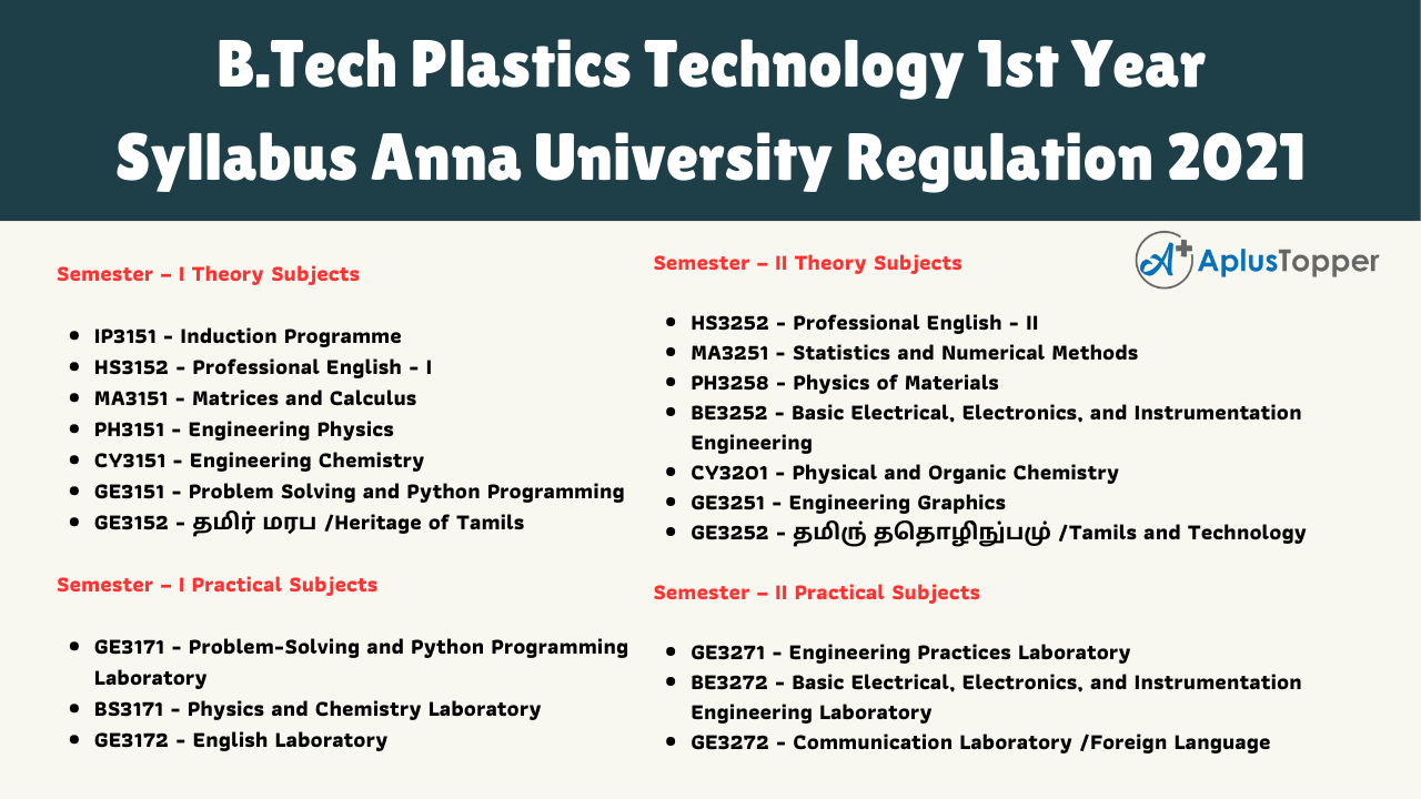 Anna University Regulation 2021 B.Tech Plastics Technology 1st-year syllabus contains two semesters. In semester 1, there are six theory subjects and three practical subjects. In semester 2, there are six theory subjects and three practical subjects. The following links will help you to get the required subject as per your need.