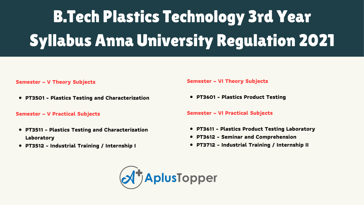 Anna University Regulation 2021 B.Tech Plastics Technology 3rd-year syllabus contains two semesters. In semester 5, there are two theory subjects and two practical subjects. In semester 6, there are three theory subjects. The following links will help you to get the required subject as per your need.