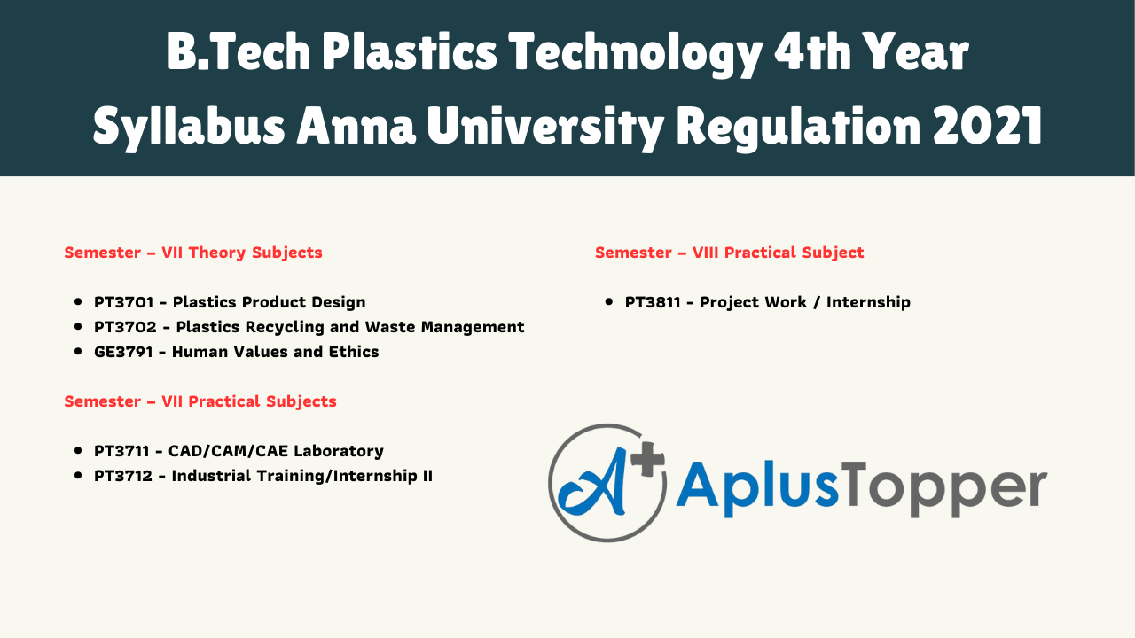 Anna University Regulation 2021 B.Tech Plastics Technology 4th-year syllabus contains two semesters. In semester 7, there is one theory and one practical subject. In semester 8, there is one practical subject. The following links will help you to get the required subject as per your need.