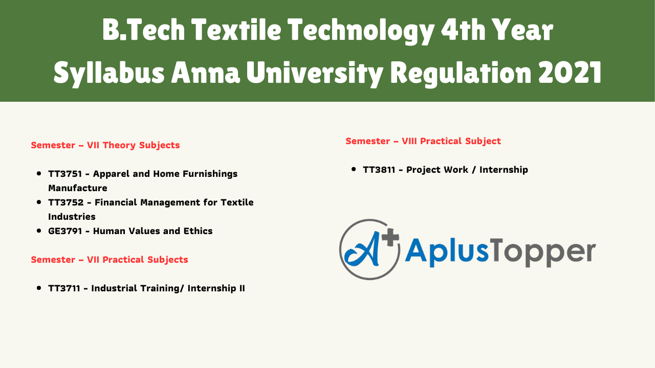 Anna University Regulation 2021 B.Tech Textile Technology 4th-year syllabus contains two semesters. In semester 7, there are three theory and one practical subject. In semester 8, there is one practical subject. The following links will help you get the required subject as needed.