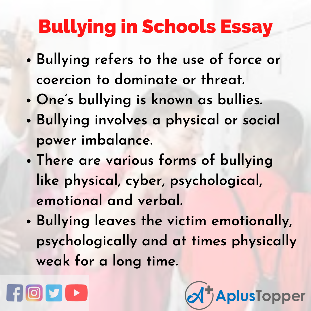 Bullying in Schools Essay: The use of coercion, force, threat to aggressively abuse or dominate is known as bullying. However, bullying and conflict are not the same things. Bullying involves an imbalance of physical or social power but so is not the case in conflicts. Bullying is not a onetime thing but in fact, is a behaviour that is repetitive.