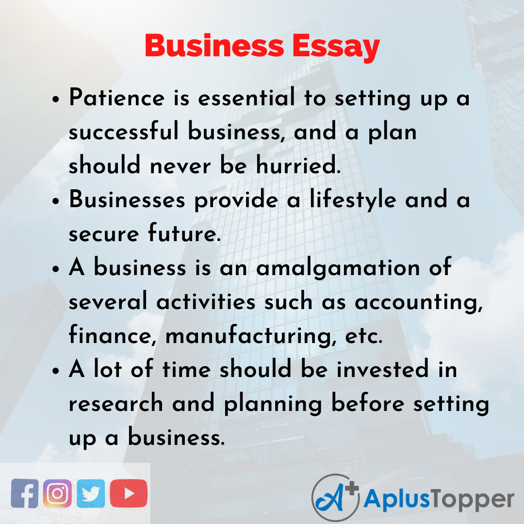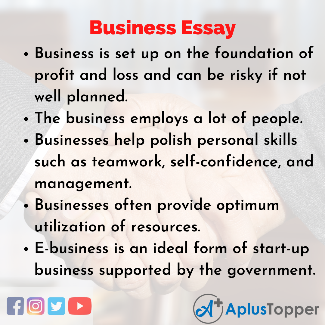 Business Essay: The act of making one’s living by earning money through the process of buying and selling different kinds of products is called business. Business is based on the foundation of profit and loss; thus, the success or failure of a business has a broad spectrum of variations.