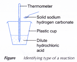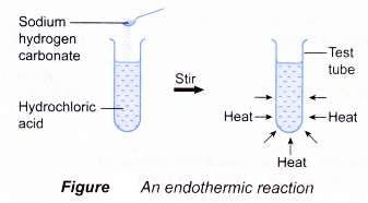 (d) the reacting mixture and the container become cold. - When sodium hydrogen carbonate is added to hydrochloric acid in a test tube, a reaction occurs and the test tube becomes cold. This is because heat has been absorbed by the reactants from the surroundings (the solvent and the container). Thus, the reaction is endothermic.