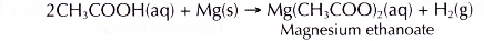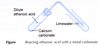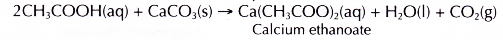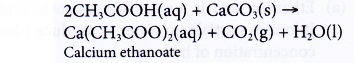(b) Ethanoic acid behaves the same way. Reaction between ethanoic acid and calcium carbonate produces a colourless solution of calcium ethanoate and effervescence of carbon dioxide.