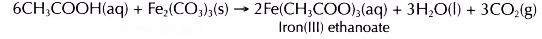- Iron(III) carbonate reacts with ethanoic acid to produce iron(III) ethanoate, water and carbon dioxide.