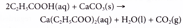 Propanoic acid reacts with calcium carbonate to form calcium propanoate, water and carbon dioxide.