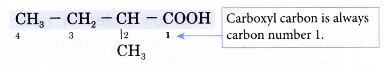 - In carboxylic acids, the carboxyl carbon atom is always the start of the longest carbon chain. Hence, the carboxyl carbon is the number 1 carbon and no number is needed to locate the carboxyl group.