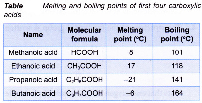- Within the carboxylic acid family, the boiling points increase with increasing number of carbon atoms per molecule. Table shows the melting and boiling points of the first four carboxylic acids.
