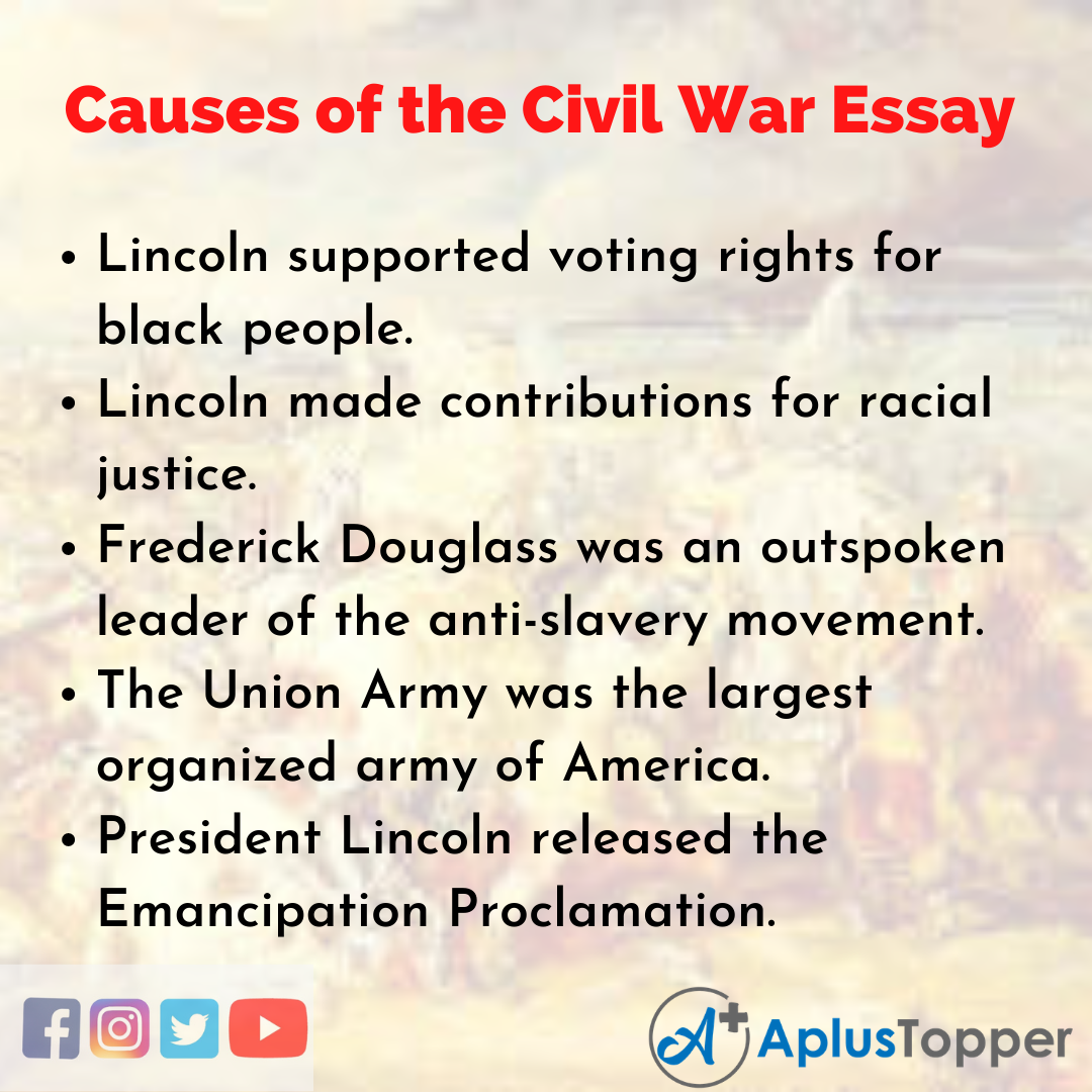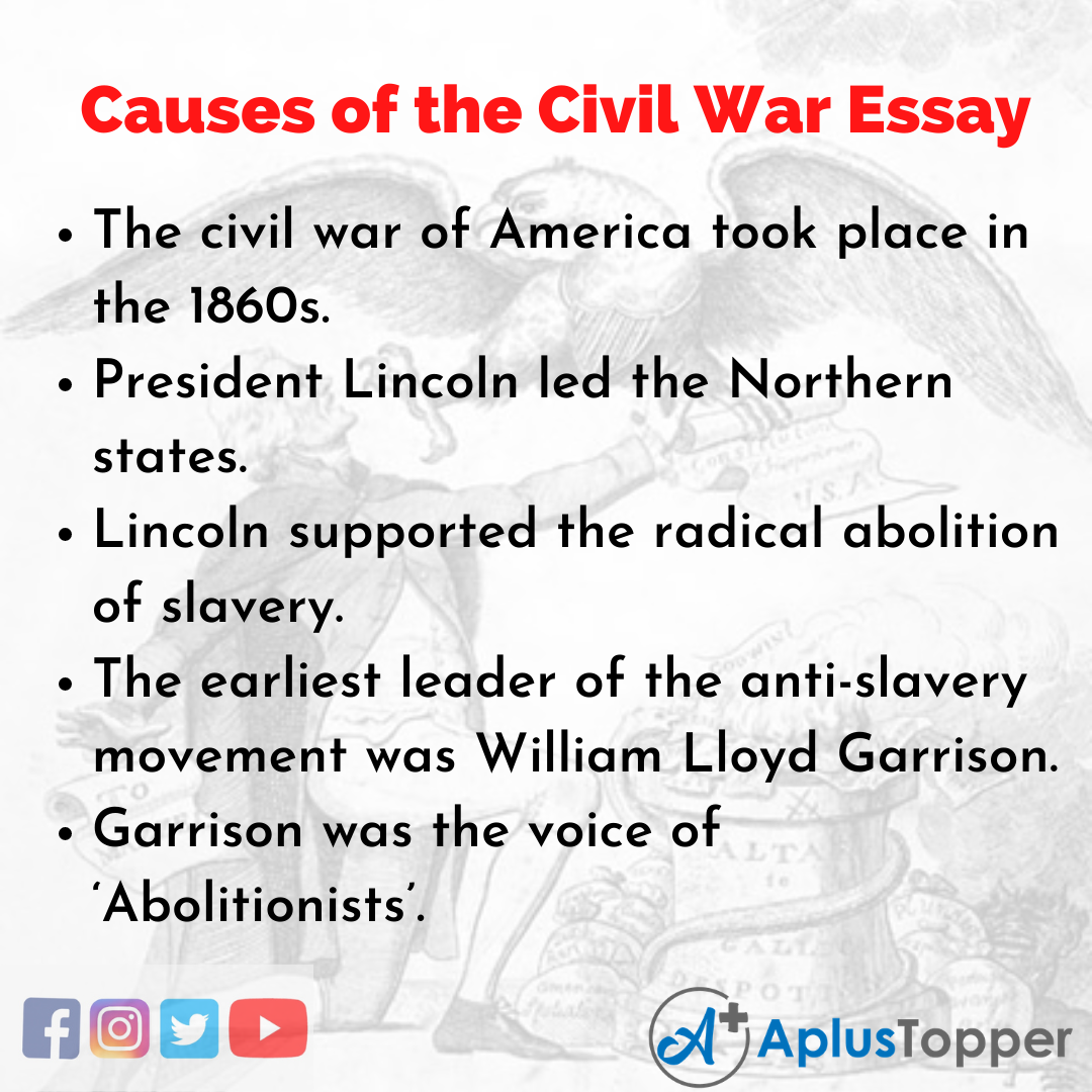 Long Essay on Causes of the Civil War Essay is usually given to classes 7, 8, 9, and 10.