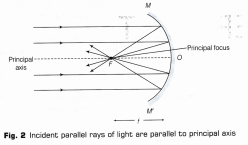 A concave mirror obeys the laws of reflection of light. In a concave mirror, rays of light are parallel to its principal axis and meet at a single point on the principal axis, after reflection from the mirror (as shown in Fig. 2). This point is the principal focus of the mirror.