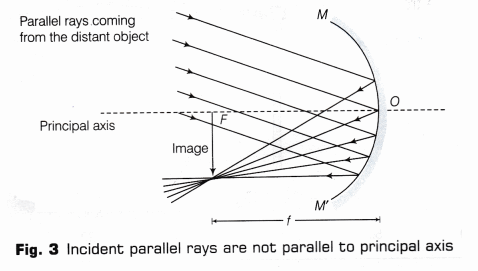 When a parallel beam of light coming from a distant object, such as tree or pole is incident on the reflecting surface of a mirror, then after reflection, the rays converge at its principal focus as shown in the Fig. 3.