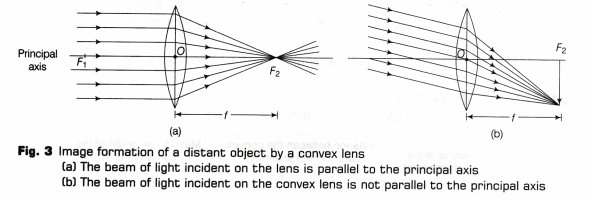 If the parallel beam of light comes from a distant object, then a real, inverted image of very small size is formed at the focus of the lens as given in the Fig. 3.