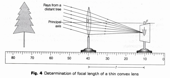 Since, the image formed by the lens is real so it can also be obtained on a screen as that of concave mirror. As, the focal length of a convex lens is equal to the distance between optical centre and any of its focus. So, focal length can be estimated by obtaining a real image of a distant object at its focus.