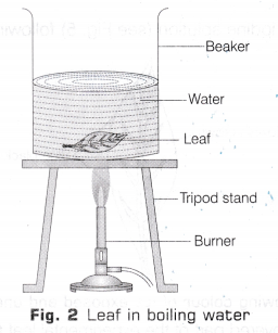 - Add the experimental leaf into it till the leaf becomes soft (Fig. 2). Switch off the burner and allow the water to come down to a temperature of 60°C.