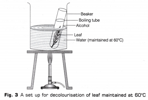 - Place this set up again in hot water beaker, with temperature maintained at 60°C. Keep the tube in this set up till the leaf become colourless (decolourisation of leaf) as shown in Fig. 3.
