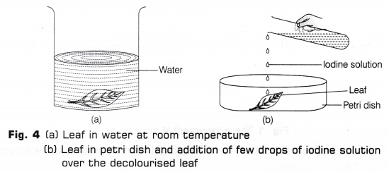 - Take the leaf out and wash it with water [Fig. 4(a)]. In a petri dish, place this leaf and add a few drops of iodine solution to it [Fig. 4(b)], Leave the set up for 5 minutes.