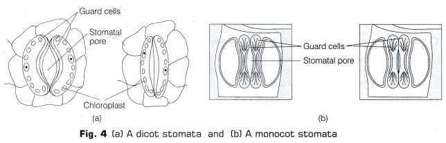 But in monocot plants, leaves have almost equal number of stomata present on both the surfaces. Guard cells are dumbbell-shaped In monocots and in dicots, guard cells are bean-shaped. In case of plants like water lily or aquatic plants, the stomata are absent,