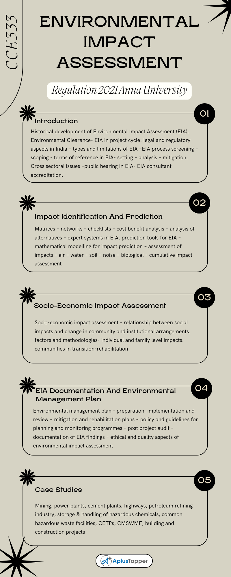 CCE333 subject code deals with the Environmental Impact Assessment syllabus of B.E Environmental Engineering. In the second year, it is included in the semester VII. This subject deals with the statistics and probability concepts to explore. In this article, we include textbooks and references to guide you to some more extent.