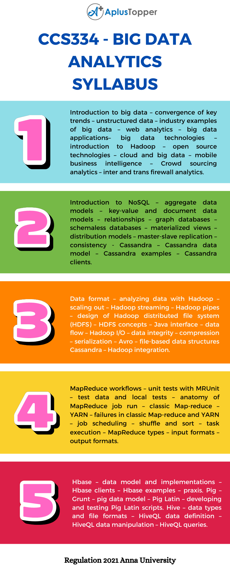 We included the proper textbooks and references to assist in some way in your preparation. It will enhance your preparation and strategies to compete with the appropriate spirit with others in the examination. If you see, you can find the detailed syllabus of this subject unit-wise without leaving any topics from the unit. In this article CCS334 – Big Data Analytics Syllabus, You can simply read the following syllabus. Hope you prepare well for the examinations. I hope this information is useful. Don’t forget to share with your friends.