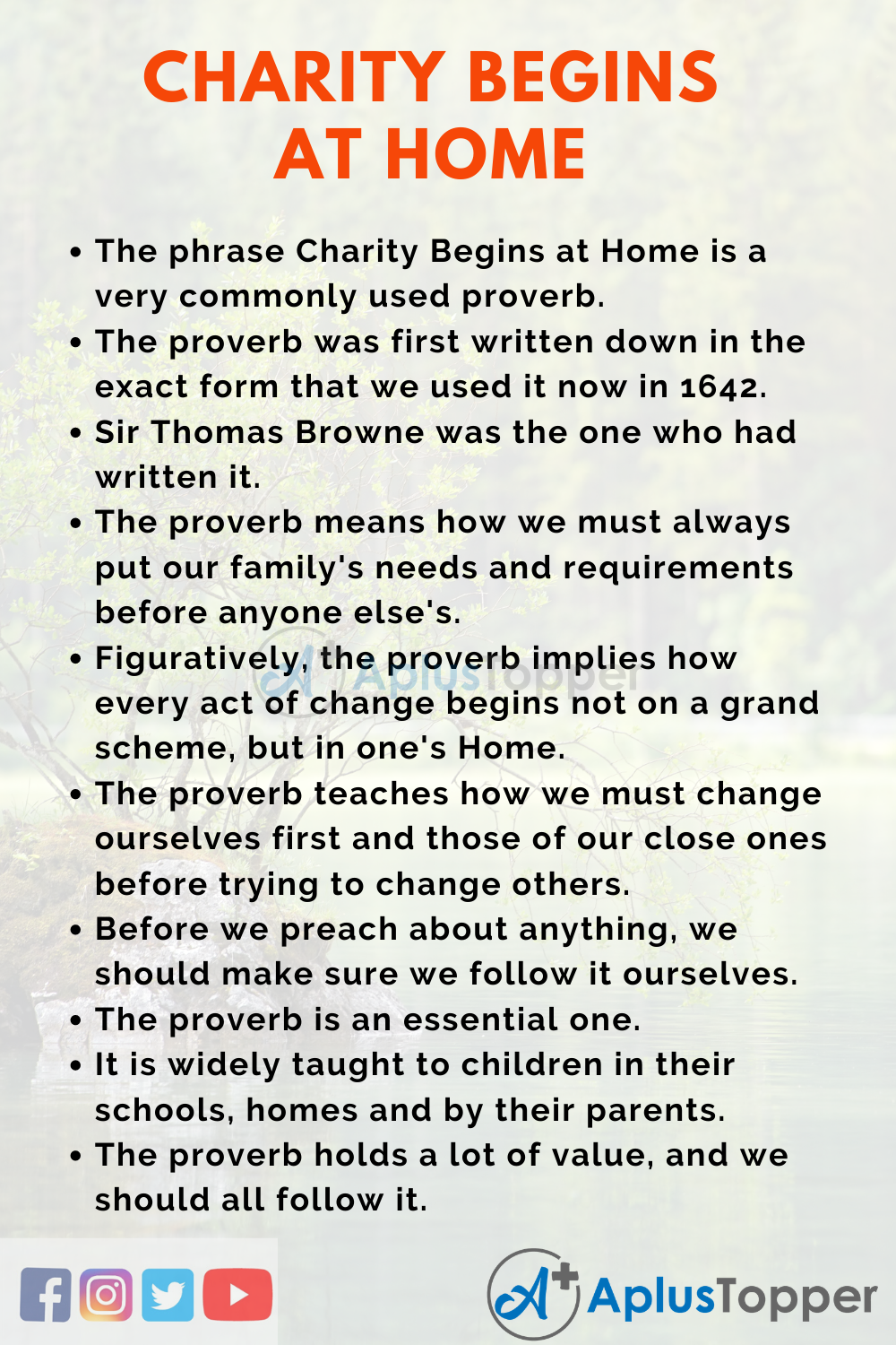 - The phrase Charity Begins at Home is a very commonly used proverb.