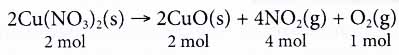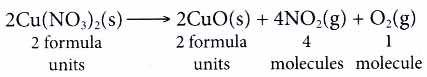 From the equation, we know that 2 moles of copper(II) nitrate decompose into 2 moles of copper(II) oxide, 4 moles of nitrogen dioxide gas and 1 mole of oxygen gas. - At the microscopic level, the coefficients in a chemical reaction tell us the number of particles 1 involved in the reaction.