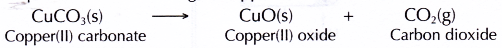 - When copper(II) carbonate is heated, it decomposes into copper(II) oxide and carbon dioxide. The presence of carbon dioxide is detected by the limewater.
