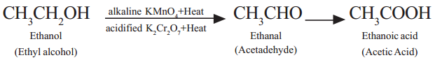 Eg: Alkaline Potassium permanganate or Acidified Potassium dichromate in solutions act as oxidizing agents and supplies oxygen to convert alcohols into carboxylic acids. Ethyl alcohol undergoes oxidation to form the product Acetaldehyde and finally Acetic acid.(see following equation).