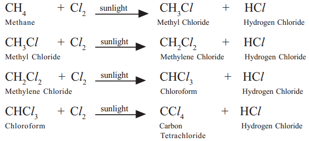 For example, methane (CH4) reacts with chlorine in the presence of sunlight. Hydrogen atoms of CH4 are replaced by chlorine atoms.
