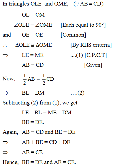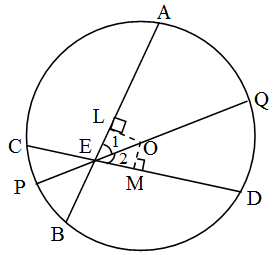 Solution: Given that AB and CD are two chords of a circle, with centre O intersecting at a point E. PQ is a diameter through E, such that ∠AEQ = ∠DEQ. We have to prove that AB = CD. Draw perpendiculars OL and OM on chords AB and CD, respectively. Now