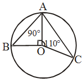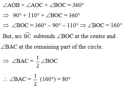 Example 8: O is the centre of the circle. If ∠BOA = 90° and ∠COA = 110°, find ∠BAC.