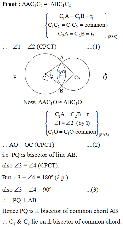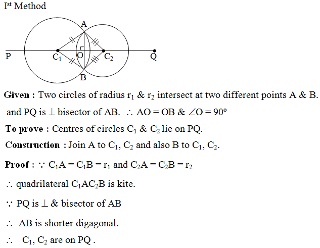Example 1: If two circles intersect at two points, prove that their centres lie on the perpendicular bisector of the common chord.