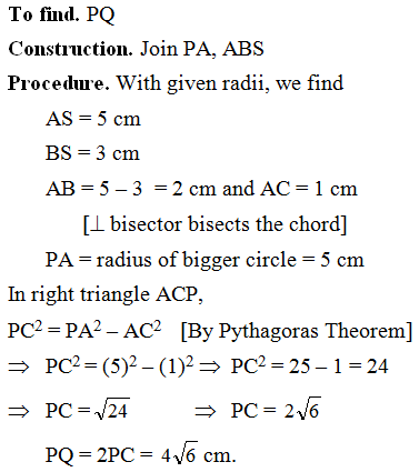 5 cm and 3 cm respectively touch each other internally. If the perpendicular bisector of segment AB meets the bigger circle in P and Q. Find the length of PQ.
