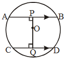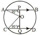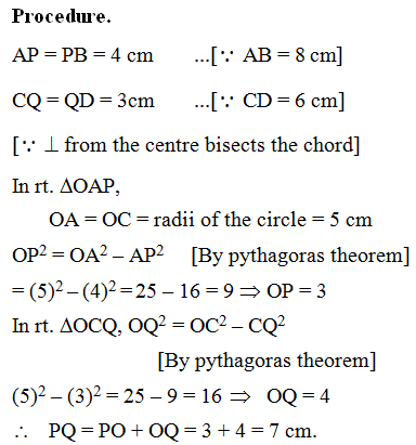 Example 10: O is the centre of the circle with radius 5 cm. OP ⊥ AB, OQ ⊥ CD, AB || CD, AB = 8 cm and CD = 6 cm. Determine PQ.