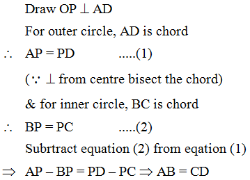 Example 11: If a line intersects two concentric circles (circles with the same centre) with centre O at A, B, C and D, Prove that AB = CD (figure)