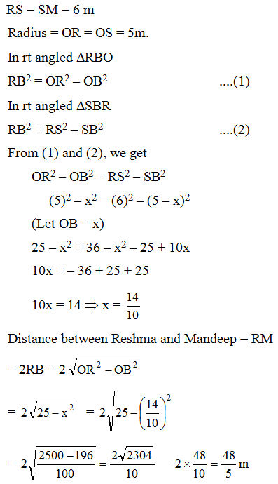 Example 3: Three girls Reshma, Salma and Mandeep are playing a game by standing on a circle of radius 5 m drawn in a pack. Reshma throws a ball to Salma, Salma to Mandeep. Mandeep to Reshma. If the distance between Reshma and Salma and between Salma and Mandeep is 6 m each. What is the distance between Reshma and Mandeep ?