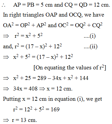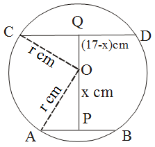 Solution: let O be the centre of the given circle and let its radius be r cm. Draw OP ⊥ AB and OQ ⊥ CD. Since OP ⊥ AB, OQ ⊥ CD and AB || CD. Therefore, points P, O and Q are collinear. So, PQ = 17 cm.