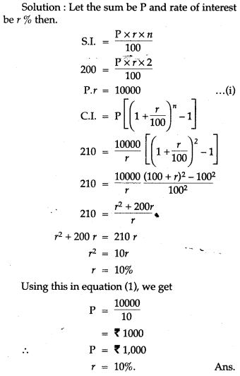 Question 1. The S.I. and C.I. on a sum of money for 2 years is Rs. 200 and 210 respectively. If the rate of interest is the same. Find the sum and rate.